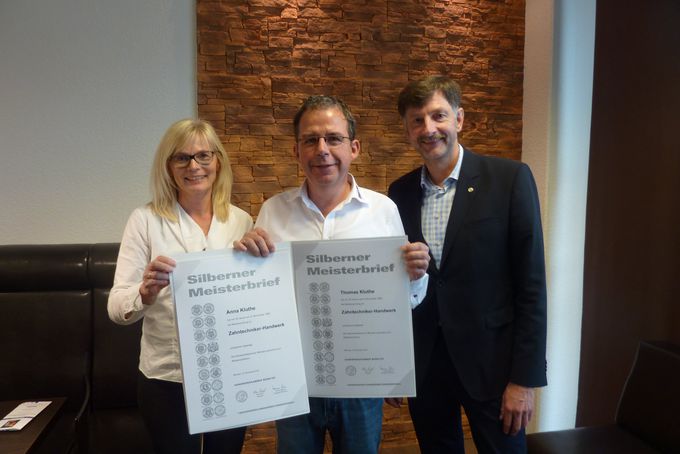 Leidenschaft für den Beruf und ein hoher Qualitätsanspruch: Das eint Anna und Thomas Kluthe, die Inhaber von Zahntechnik Kluthe in Paderborn. Am Dienstag, den 17. November 2015 überreicht der Obermeister der Handwerksinnung Bielefeld, in der Thomas Kluthe schon seit vielen Jahren zum Innungsvorstand gehört, dem Ehepaar den Silbernen Meisterbrief für je 25 Jahre erfolgreiche Zahntechnik.